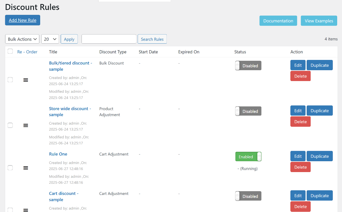 The plugin also gives you an intuitive and user-friendly way to manage all these features from a central dashboard. It comes with small nifty features that let you quickly activate/deactivate discount rules, reorder them, and easily duplicate to copy existing rules and create similar promotions. Plus, you can Import and Export Rules, which is incredibly useful for managing discounts across multiple stores or for backup purposes.