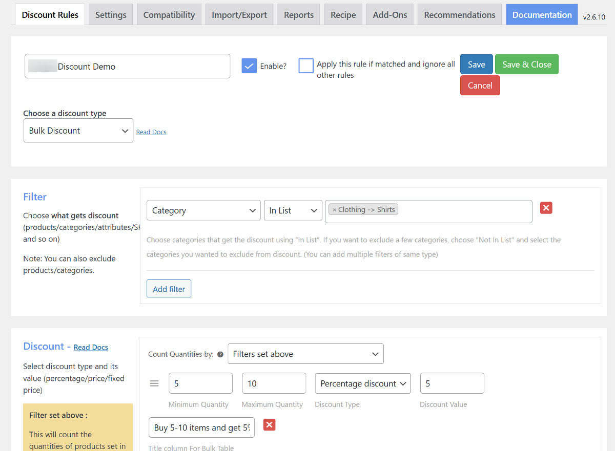 - Bulk Discount: This is perfect for implementing quantity-based or tiered pricing. You can reward customers for buying more by offering progressively higher discounts as the quantity of items increases. For example, you can offer something like "Buy 5-10 items and get 5% off, buy 11-20 items for 10% off," and so on.