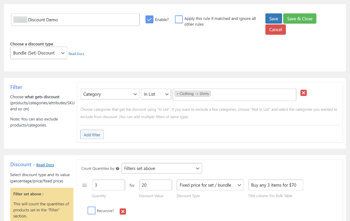 - Bundle (Set) Discount: With bundle discounts, you can package multiple items together and offer them at a discounted fixed price. This encourages customers to purchase complementary products they might not have considered individually. Examples of this discount type include "Buy any 3 items for $70" or "Get a laptop and a bag together for a special price."
