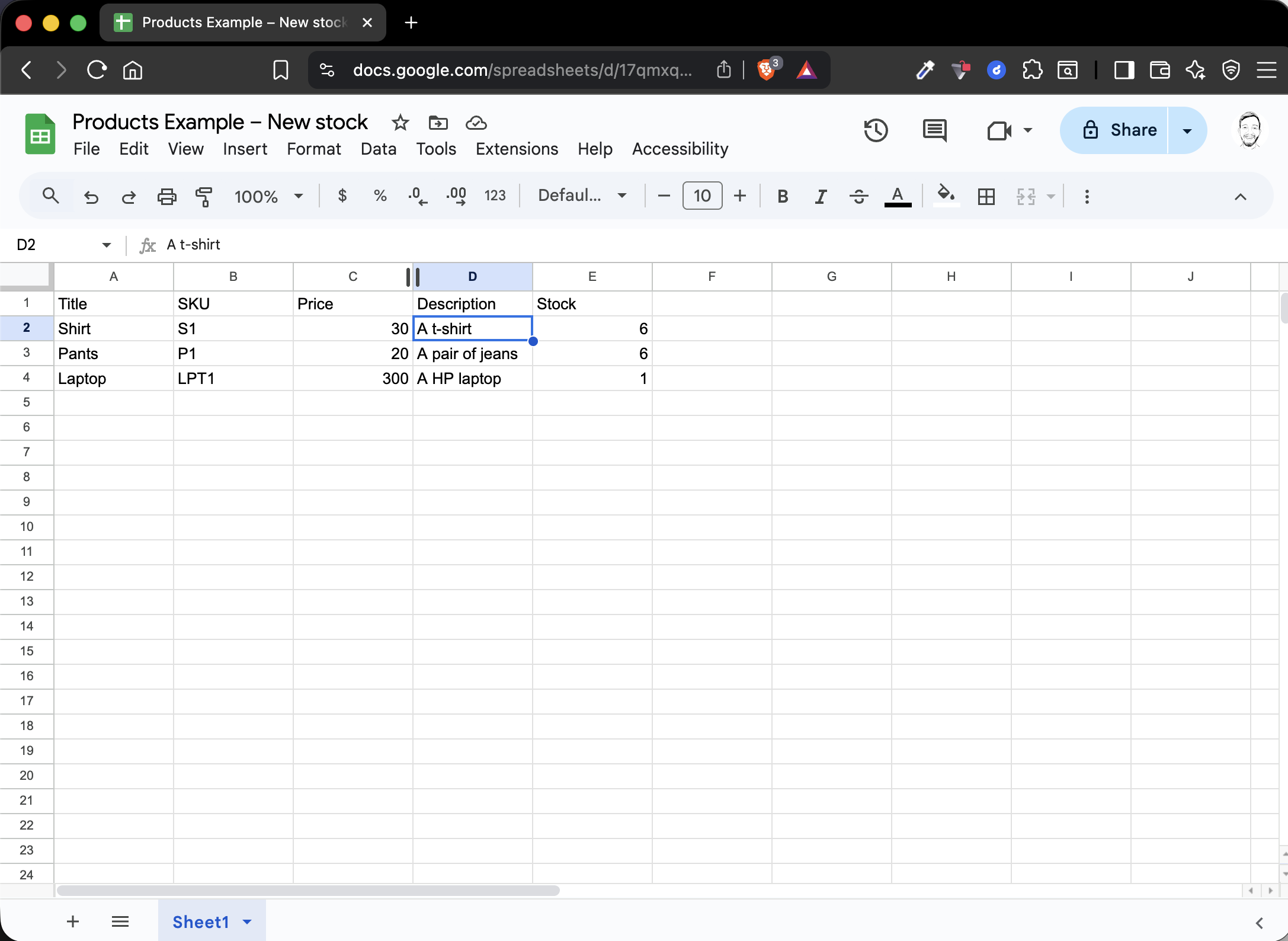 Open Google Sheets, click on Start a new spreadsheet and set up columns for each data element you plan to import (e.g., title, content/description, price, images, categories, SKU, etc). One row per record works best. As previously explained, this data goes on the first sheet of your spreadsheet.