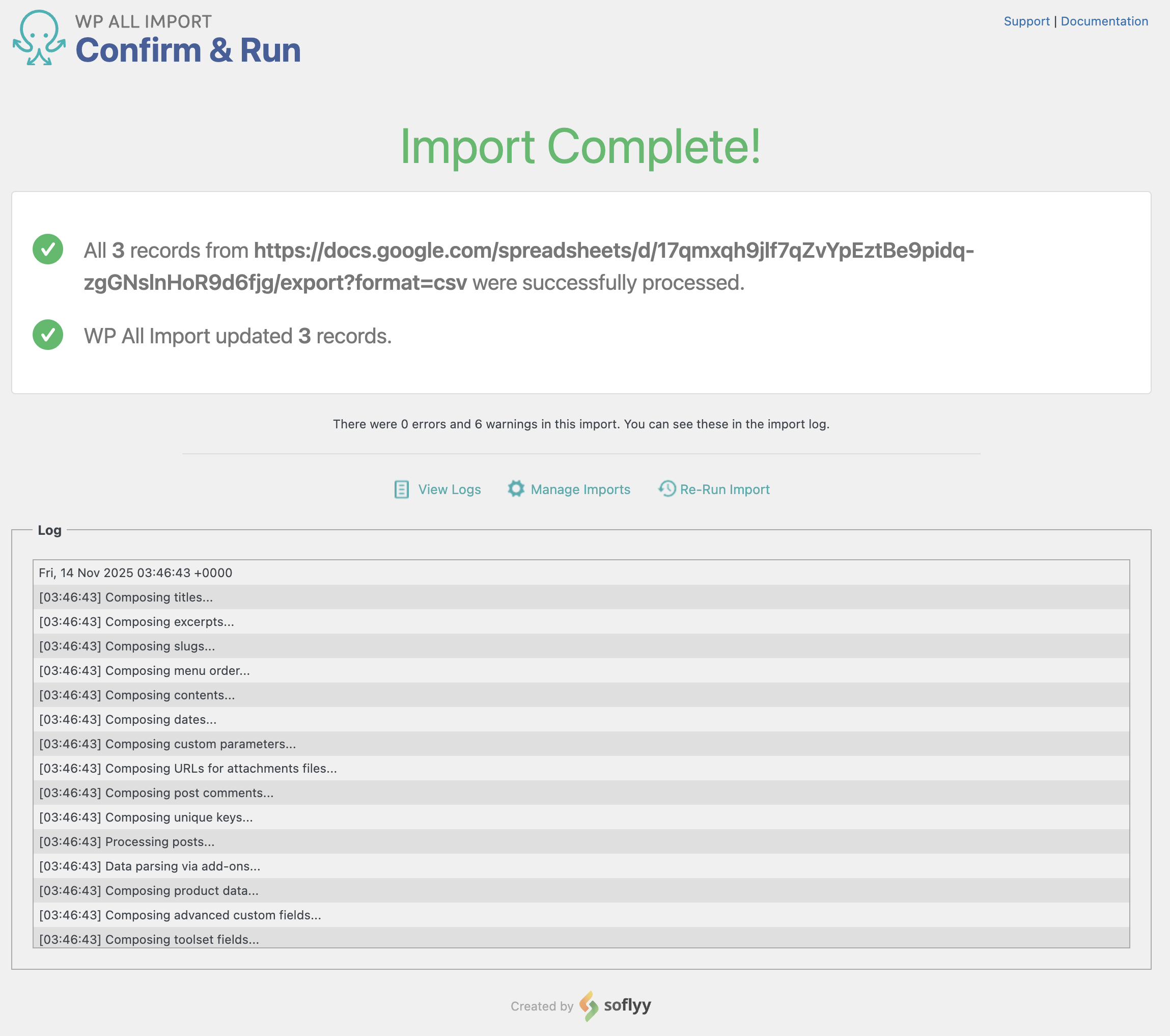 Confirm titles, content, taxonomies, images, and custom fields alike. If anything needs adjusting, tweak your field mappings, or update rules, or update the import data, and then re-run the import. WP All Import will respect your import settings and update the matching items based on that.