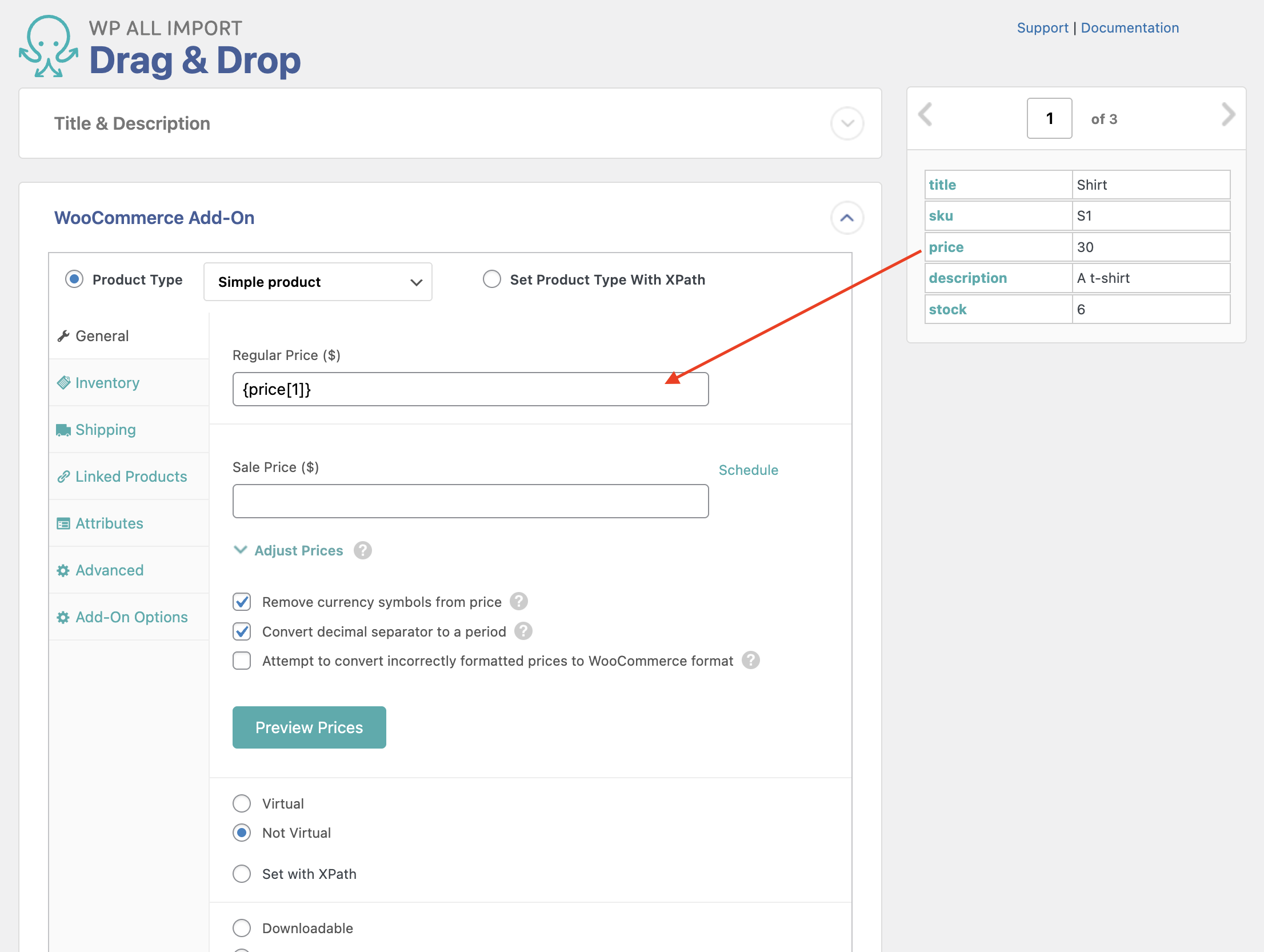 You can import WooCommerce products, variations, prices, stock, images, and attributes by choosing the WooCommerce post type during setup and using our WooCommerce Import Add-On Pro.
