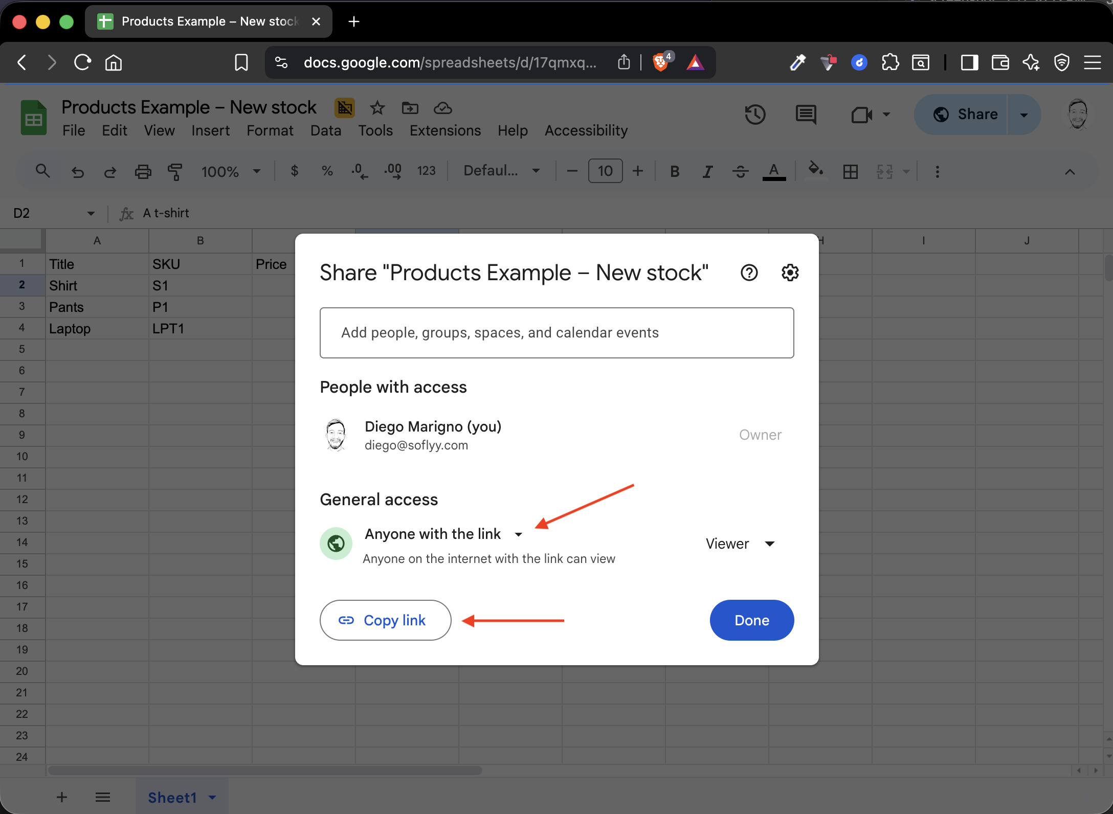 When your data looks good, make the sheet accessible by obtaining a sharing link. To do so, click Share › under General access choose Anyone with the link › Copy link.