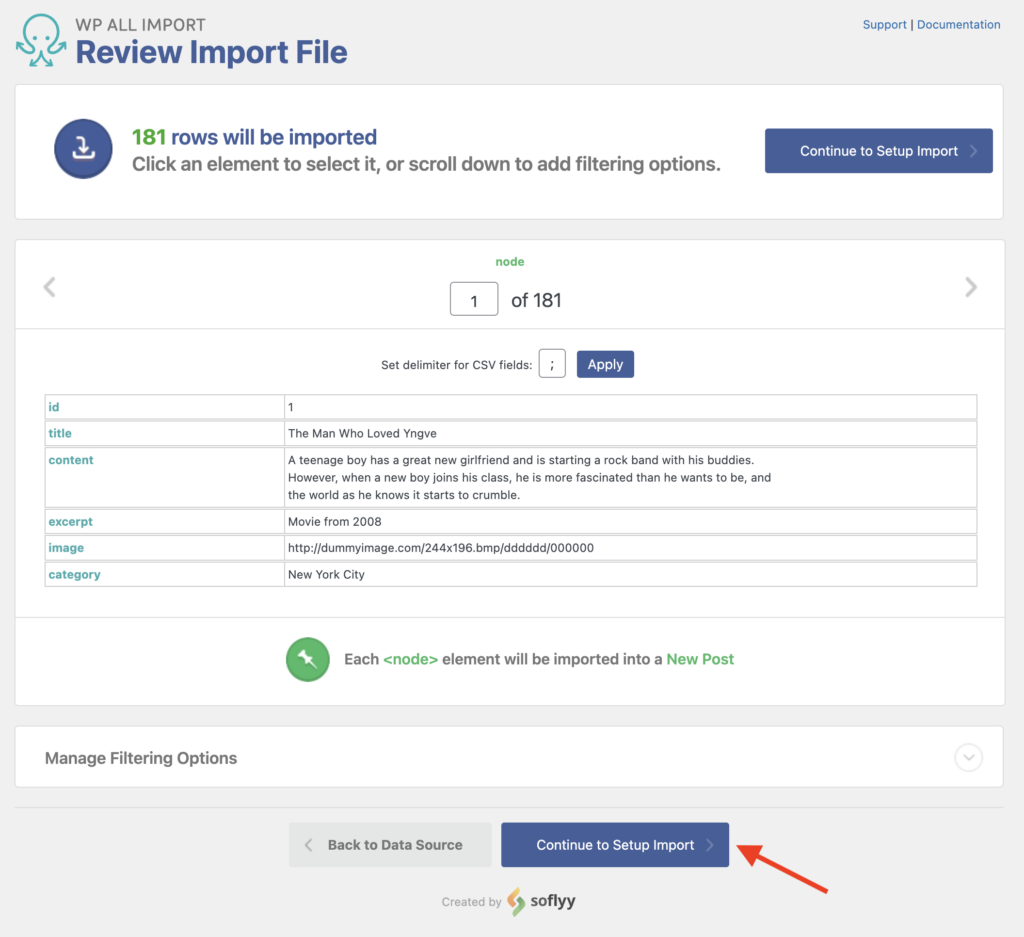 Navigate to All Import › New Import and select your import file. Choose to import Posts in the dropdown list, then click to either Create Filters (see Step 2), or Set Up Import (see Step 3).