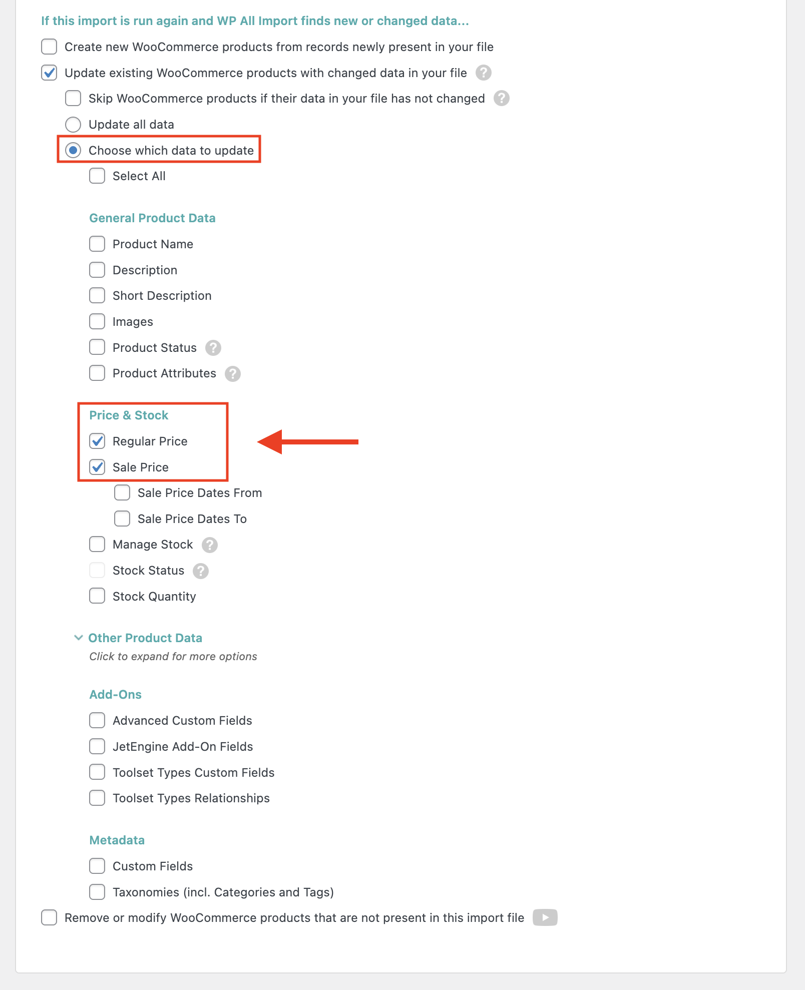 Now you need to specify the correct custom field names for prices using the Choose which data to update option in Step 4. We should update the Regular Price field. If we use sale pricing, we should also update the Sale Price field.