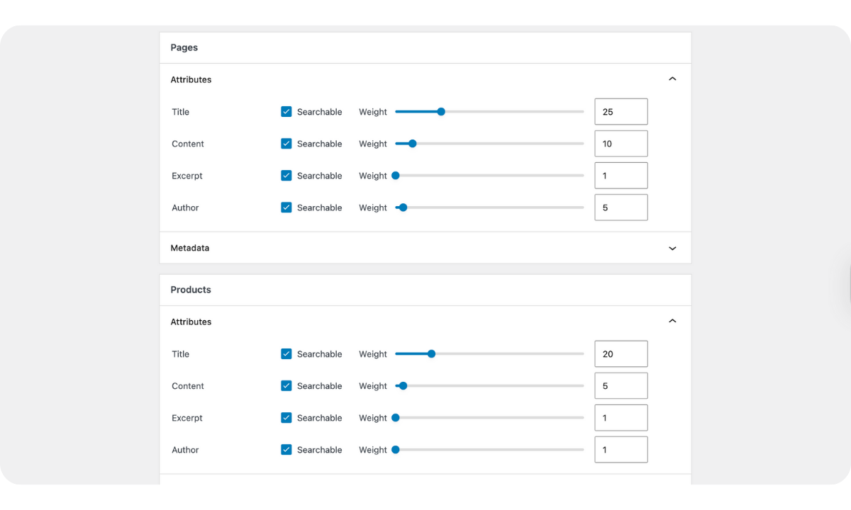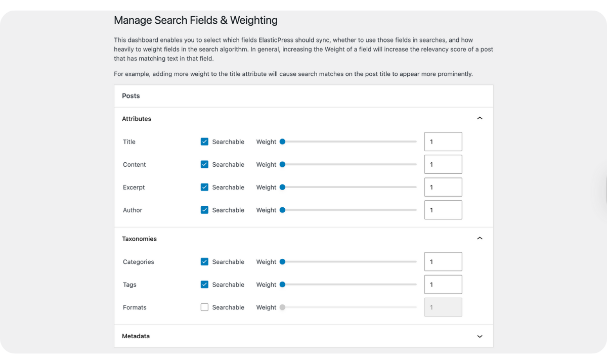 Click Search Fields & Weighting to specify which fields ElasticPress should sync, whether to include those fields in searches, and how heavily to weight them in the search algorithm.