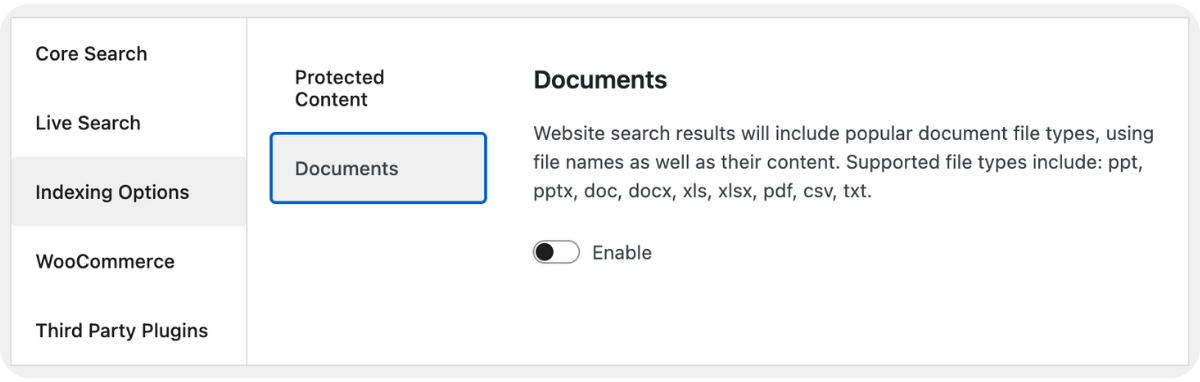 The plugin also supports document indexing, which enables it to display file types such as ppt, pptx, pdf, docx, xls, txt, and more in search results.