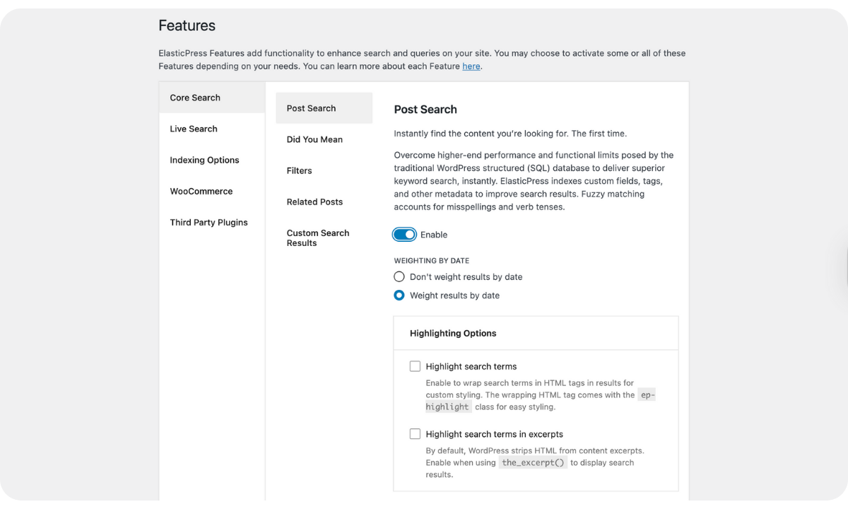 Users who want to further customize ElasticPress to meet their unique search needs can explore the other available settings.
