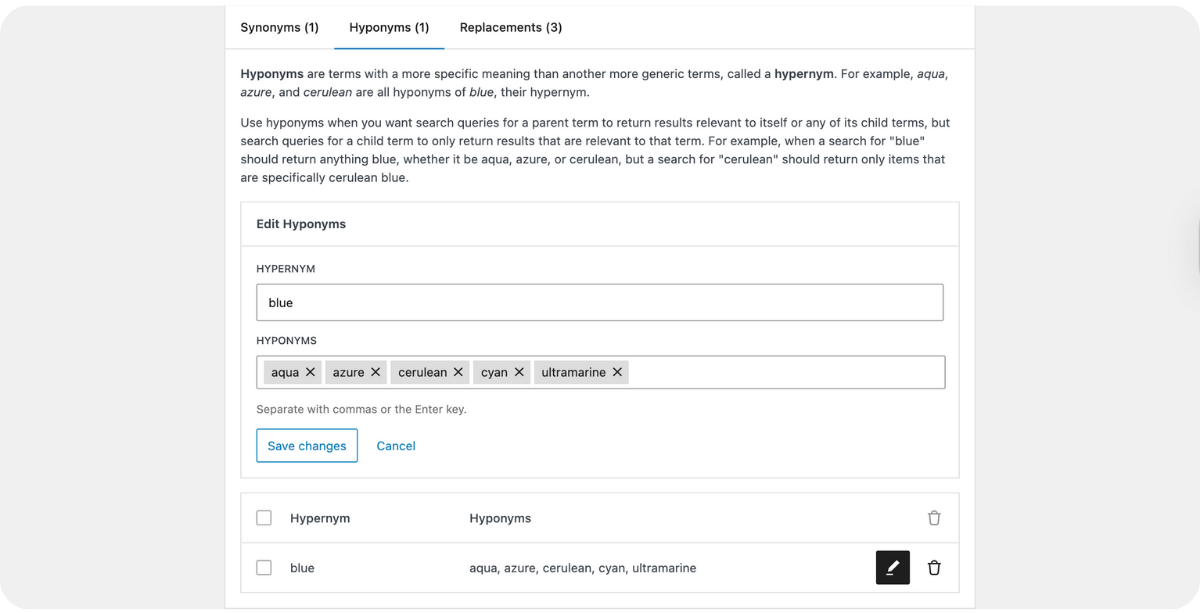 - Synonyms: This feature adds flexibility to the search experience, helping site users find relevant results even when what they enter in the search bar is not an exact match. The feature offers three options - Synonyms, Hyponyms, and Replacements.
