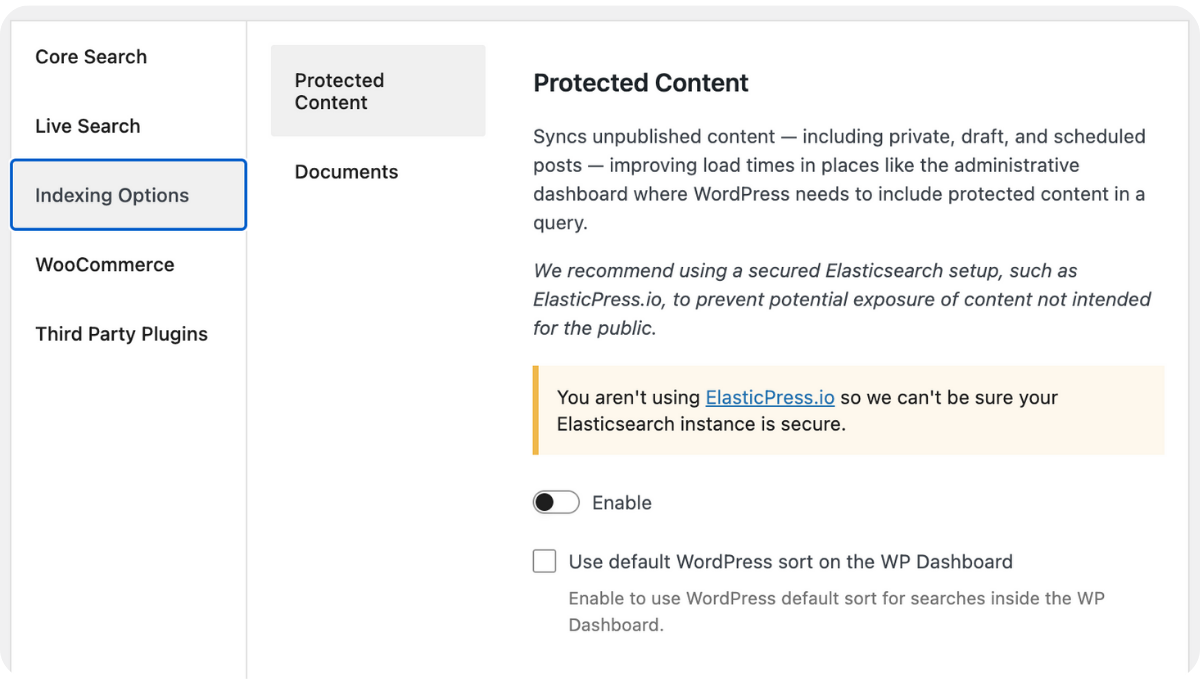 ElasticPress lets users index all their content, including private and unpublished content, to speed up searches across the entire website, including the admin panel.