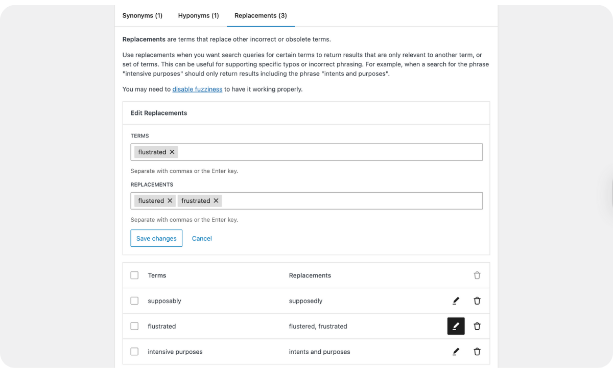 - Replacements: Users can add terms to replace incorrect ones. For example, the search term “flustrated” can be set to return “flustered” or “frustrated” as the correct replacements.