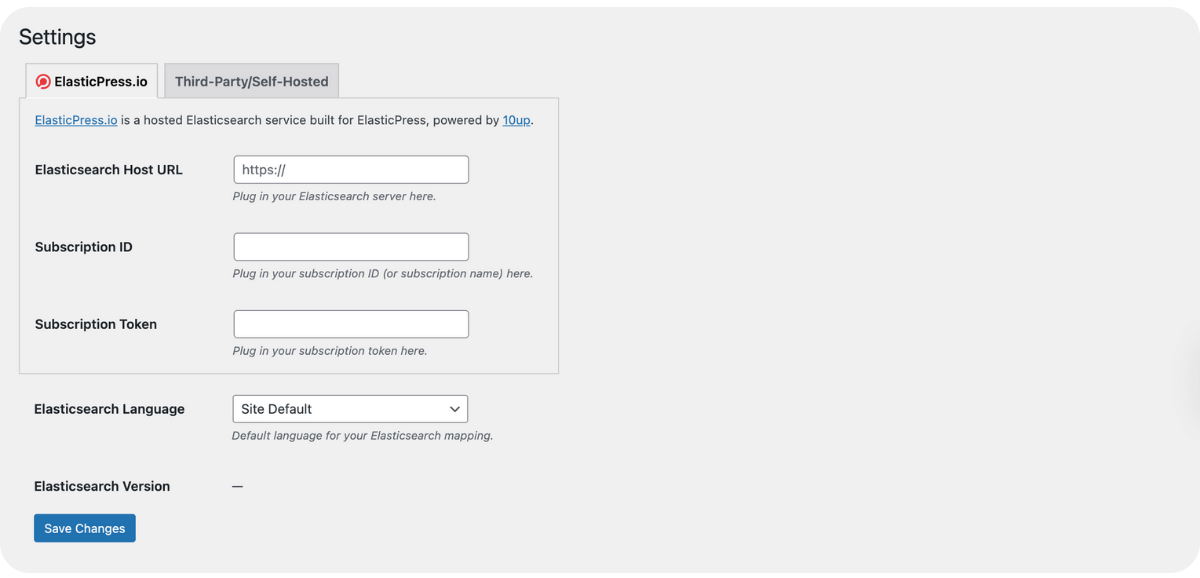 First, set up Elasticsearch hosting by clicking Got hosting? Get started. On the Settings page that appears, choose the correct hosting service option for your setup, enter the details, and then click Save Changes.