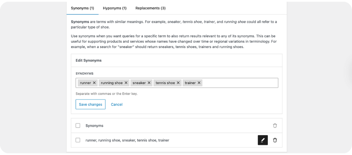 - Synonyms: This lets users add all the variations of terms with similar meanings, e.g., “tennis shoes”, “sneakers”, and “trainers”.