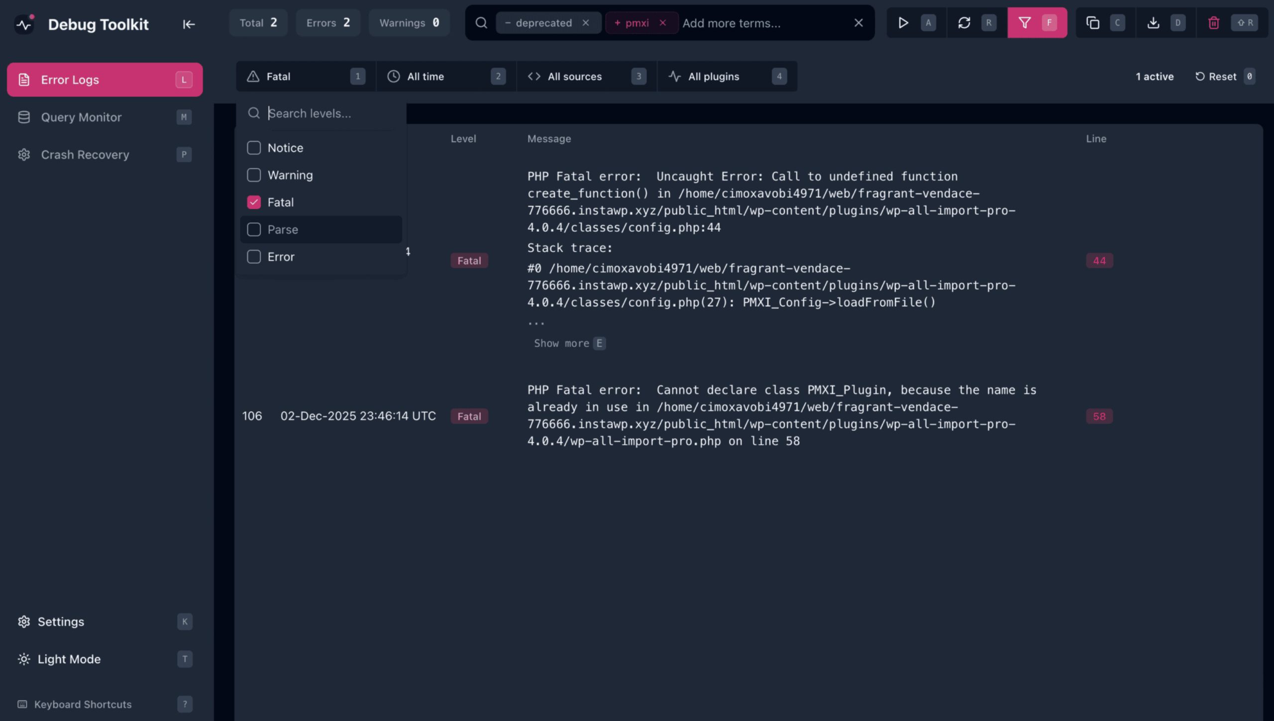 WP Debug Toolkit can still record the critical error details even when a request dies early. That means you can often log into the admin, see the fatal error responsible, identify the triggering theme file, and take corrective action without flying blind.