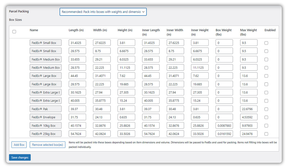- Packing Into Boxes with Weights and Dimensions: This approach optimizes space by using predefined box sizes. Items are packed into custom boxes based on their dimensions and volume, reducing the number of packages needed. If an item doesn’t fit into the specified boxes, it is packed separately. Some carriers, such as FedEx, also offer standard boxes that businesses can use to streamline packaging further.