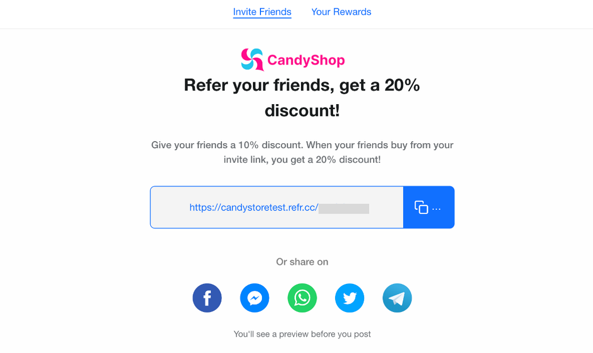 For the Reward campaign type, ReferralCandy provides a hosted portal where advocates can easily grab their unique referral link and share it directly on social media. They also get a rewards page where they can see the friends they have referred.