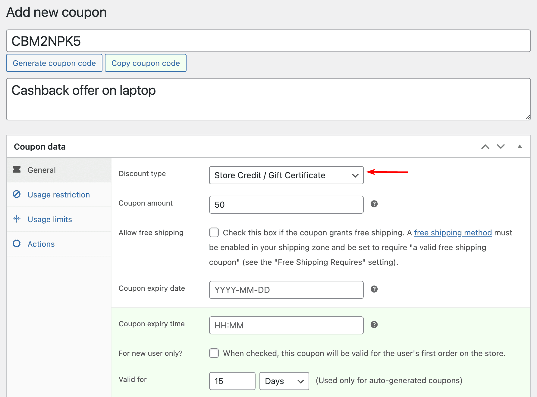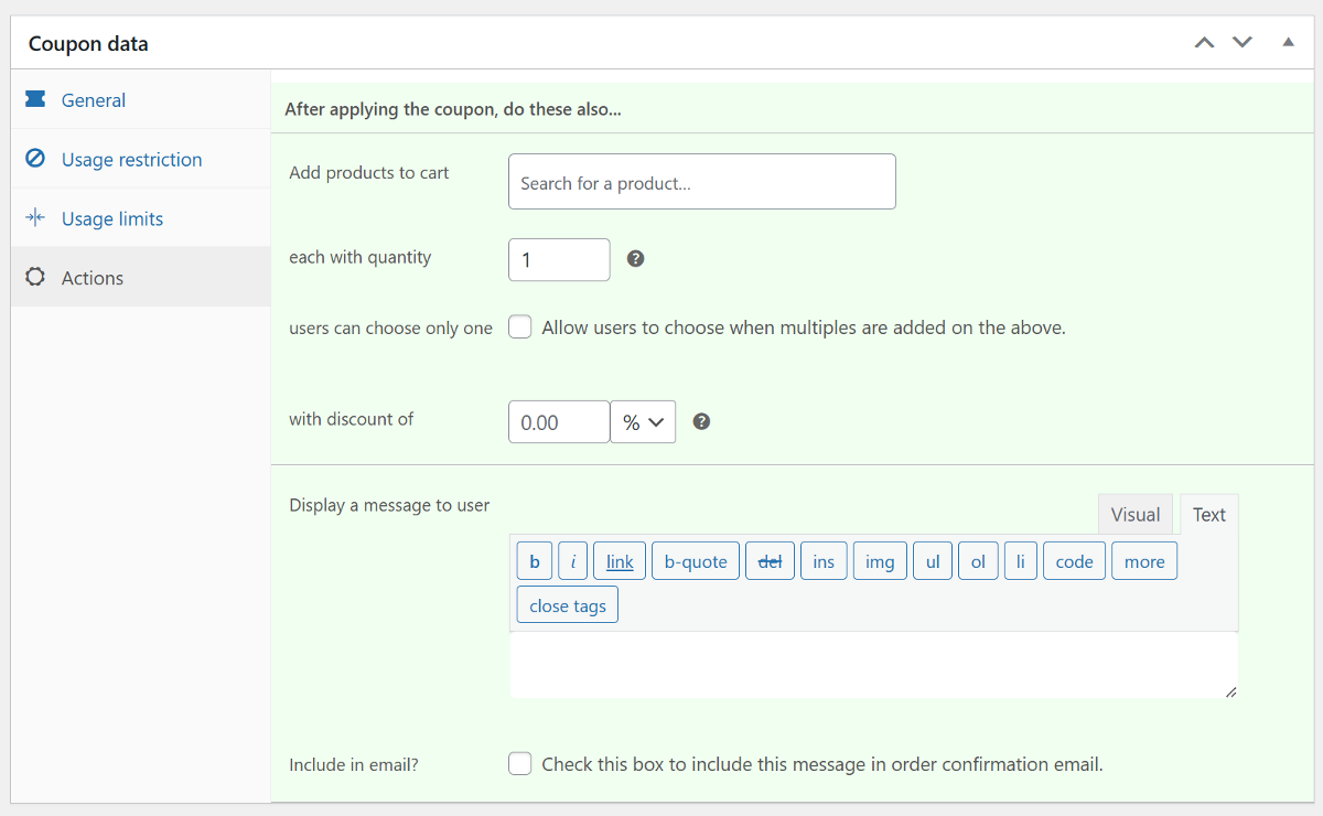It uses the same well-organized tab system interface to arrange all the different settings for generating coupons. You can click through familiar tabs like General, Usage restriction, and Usage limits to configure the features. Most settings are configurable with simple clicks, selections, or typing in the provided field. What's more, the plugin makes it easy to spot its own added settings, as they typically have a subtle green background, clearly indicating which options are part of Smart Coupons' extended capabilities.
