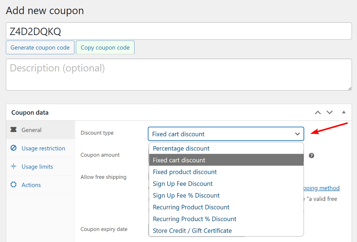 When you try to create a new coupon, you’ll find a Discount type dropdown menu, which actually showcases the variety of promotions you can make.
