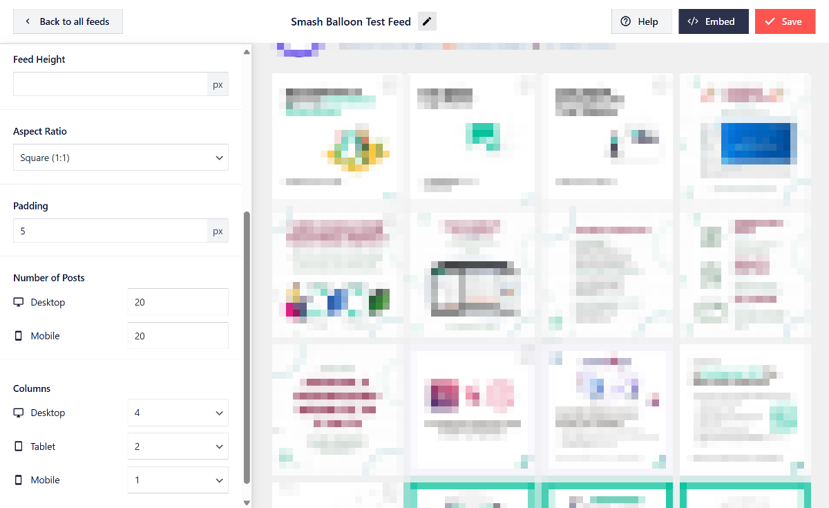 You can also adjust the general sizing and spacing of the feed, such as its height, aspect ratio, and padding. The number of columns in your feed can be set differently for desktop, tablet, and mobile views.