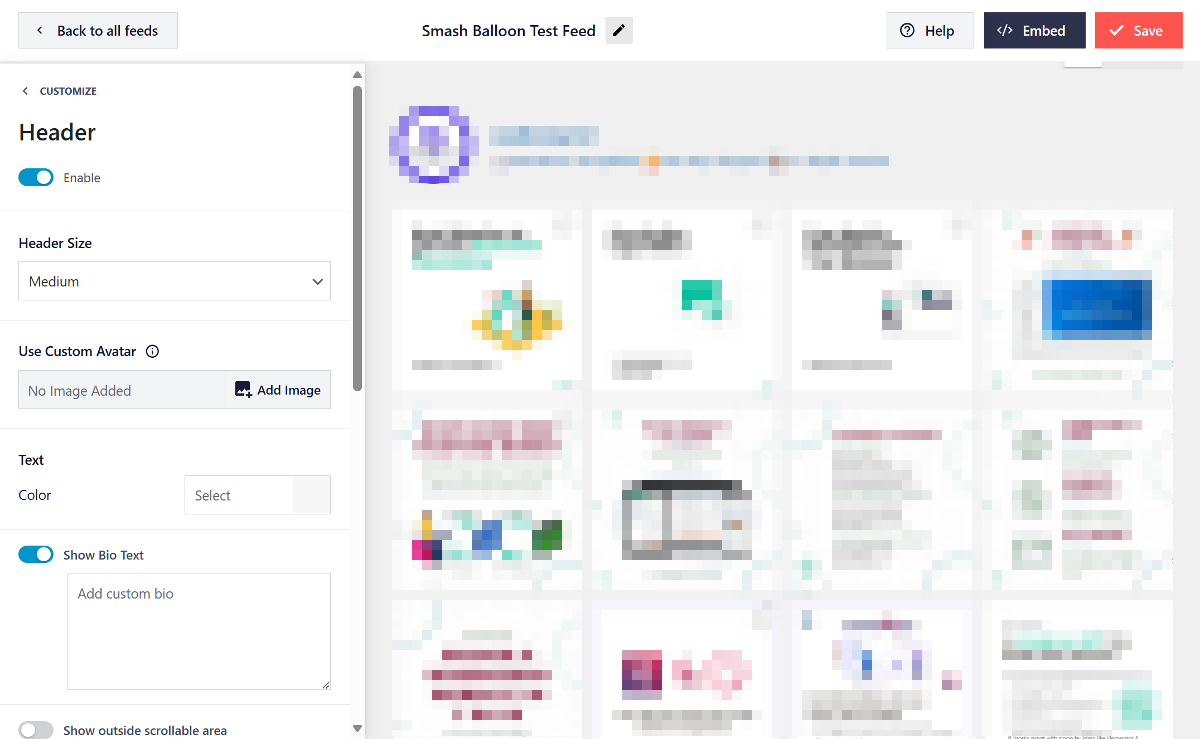 Similarly, for the feed header, you can choose to show or hide it, and even include elements like your Instagram profile picture, bio, and follower count.