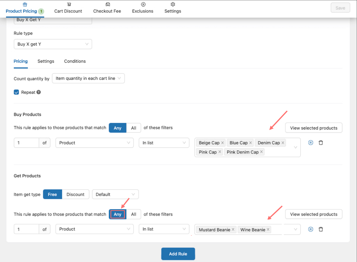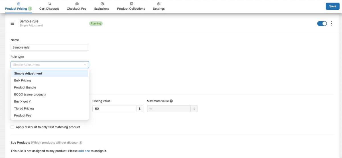 - Product Fees: Instead of a discount, this rule allows you to add an extra charge to a product. This is useful for things like handling fees, environmental charges, or other custom fees.