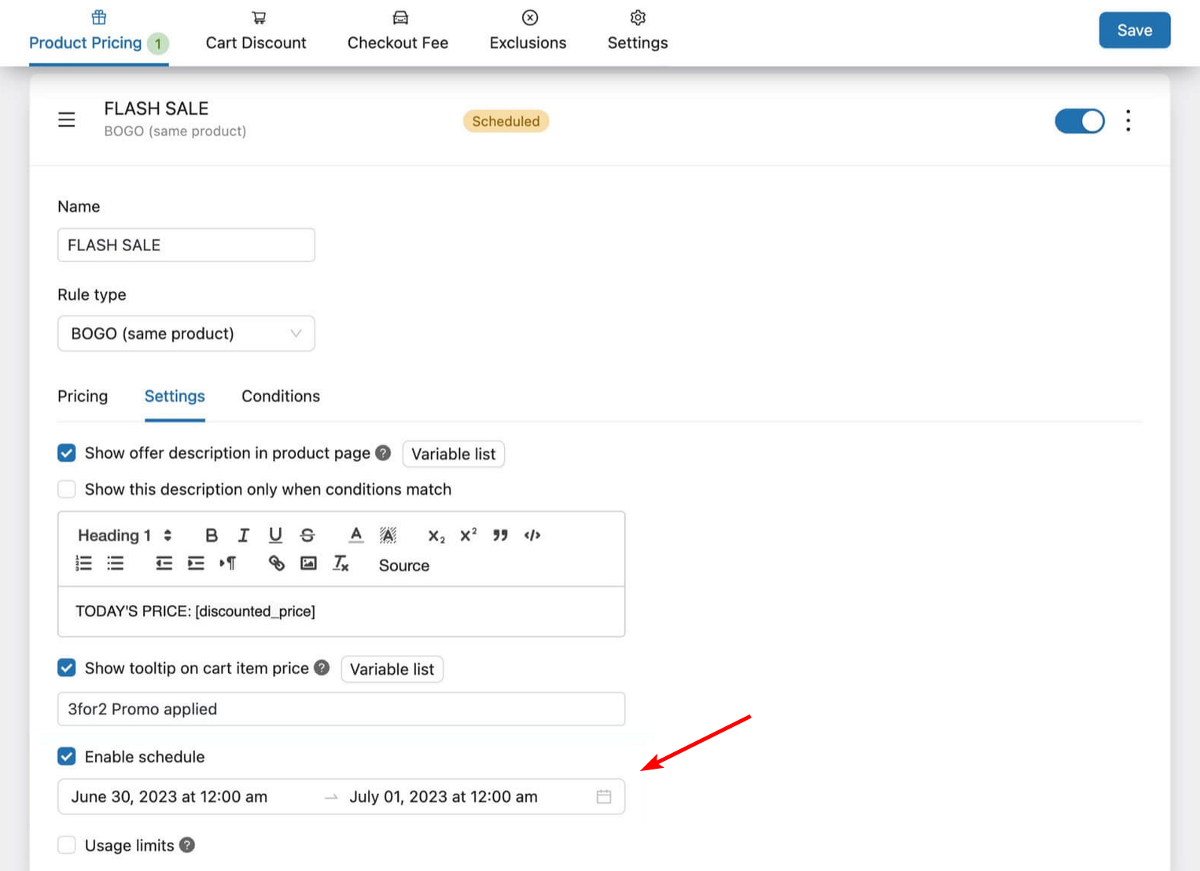 - Scheduling & Usage Limits: You can plan your campaigns ahead of time by setting start and end dates for any rule. You can also limit how many times a discount can be used in total or per customer, which is perfect for flash sales and exclusive offers.
