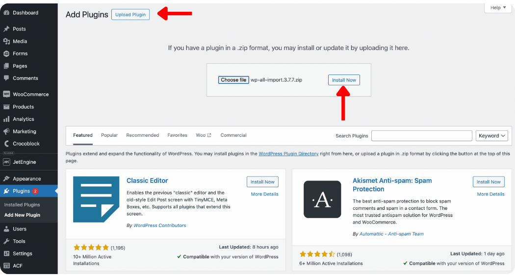 Next, click Upload Plugin and Choose file. Select the WP All Import plugin to install it first. Then click Install Now › Activate Plugin and the plugin will be installed and activated on your site.