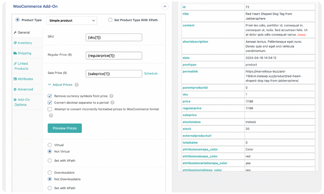 Next, open the WooCommerce Add-On panel to map the standard WooCommerce product detail fields.