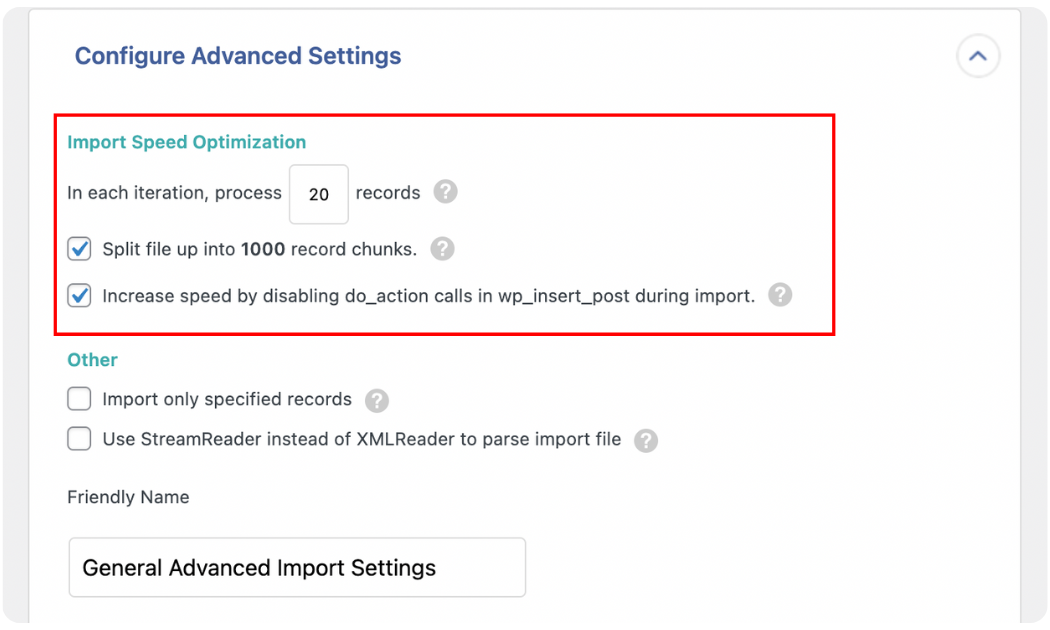 By default, the option to Increase speed by disabling do_action calls in wp_insert_post during import is enabled. It is important to leave it enabled because, by default, WP All Import uses the wp_insert_post function every time it creates a new post, and this function can be rather slow since it was designed to create posts one by one rather than all at once.