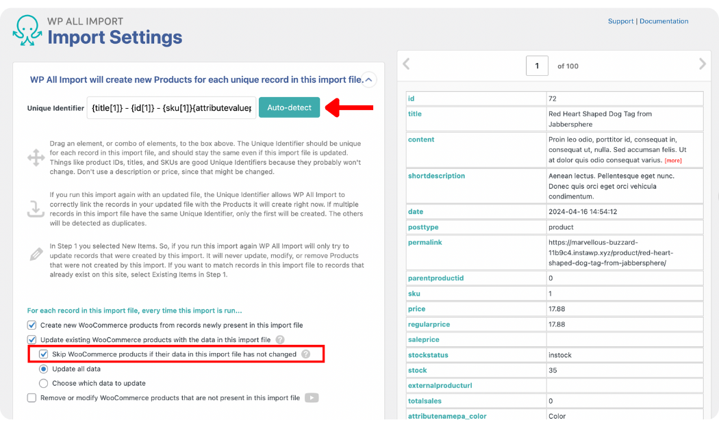 The first step here is to set a Unique Identifier for your import. The Unique Identifier enables WP All Import to correctly link records in your current import file to those in an updated file if you re-run the import in the future. Click the Auto-detect button to allow WP All Import to auto-create the Unique Identifier.