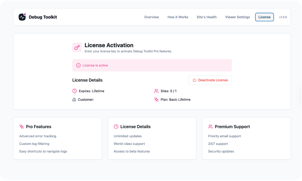 - Navigate to Debug Toolkit to set up your debugging environment: From the WordPress admin menu, select Debug Toolkit to open the setup page. First, activate your installation by clicking License on the menu and entering your license key.
